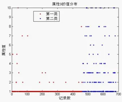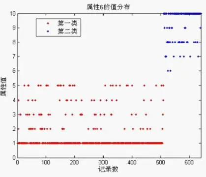 总的分类正确率中,属性9最低,属性6最高,这与ReliefF算法测试的结果大致相似,但是由于ReliefFar算法中间部分权重接近,所以也区分不明显。说明特征属性权重的判断对分类是有影响的。上述单独分类中,只将需要分类的列数据取出来,输入到K-means算法中即可。由于输入数据的变化,K-means分类时结果肯定是有差距的,所以单独从一个属性判断其类型是不可靠的。下面选择了单个分类时最高和最低的情况,绘制其分类属性值分布图,如下图所示: