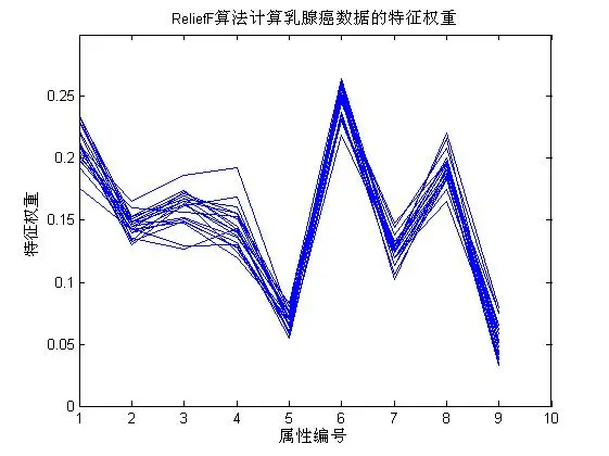 对上述数据进行转换后,以及数据说明可知,可以用于特征提取的有9个指标,样品编号和分类只是用于确定分类。本文的数据处理思路是先采用ReliefF特征提取算法计算各个属性的权重,剔除相关性最小的属性,然后采用K-means聚类算法对剩下的属性进行聚类分析。