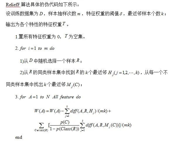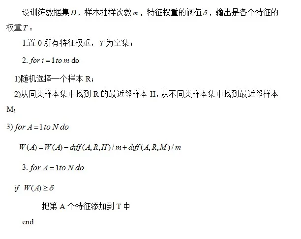 Relief算法最早由Kira提出,最初局限于两类数据的分类问题。Relief算法是一种特征权重算法(Feature weighting algorithms),根据各个特征和类别的相关性赋予特征不同的权重,权重小于某个阈值的特征将被移除。Relief算法中特征和类别的相关性是基于特征对近距离样本的区分能力。算法从训练集D中随机选择一个样本R,然后从和R同类的样本中寻找最近邻样本H,称为Near Hit,从和R不同类的样本中寻找最近邻样本M,称为NearMiss,然后根据以下规则更新每个特征的权重:如果R和Near Hit在某个特征上的距离小于R和Near Miss上的距离,则说明该特征对区分同类和不同类的最近邻是有益的,则增加该特征的权重;反之,如果R和Near Hit在某个特征的距离大于R和Near Miss上的距离,说明该特征对区分同类和不同类的最近邻起负面作用,则降低该特征的权重。以上过程重复m次,最后得到各特征的平均权重。特征的权重越大,表示该特征的分类能力越强,反之,表示该特征分类能力越弱。Relief算法的运行时间随着样本的抽样次数m和原始特征个数N的增加线性增加,因而运行效率非常高。具体算法如下所示: