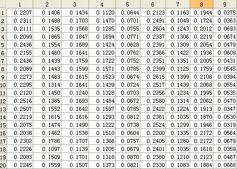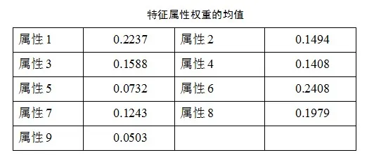 本文采用3.1节中的ReliefF算法来计算各个特征的权重,权重小于某个阈值的特征将被移除,针对本文的实际情况,将对权重最小的2-3种剔除。由于算法在运行过程中,会选择随机样本R,随机数的不同将导致结果权重有一定的出入,因此本文采取平均的方法,将主程序运行20次,然后将结果汇总求出每种权重的平均值。如下所示,列为属性编号,行为每一次的计算结果: