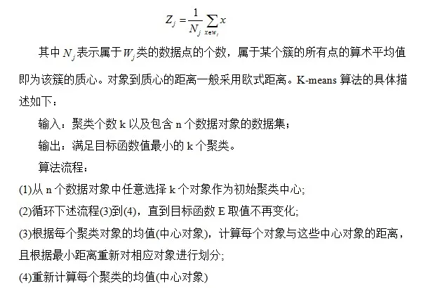 K-means算法是一种常用的基于划分的聚类算法。K-means算法是以k为参数,把n个对象分成k个簇,使簇内具有较高的相似度,而簇间的相似度较低。K-means的处理过程为:首先随机选择k个对象作为初始的k个簇的质心;然后将余对象根据其与各个簇的质心的距离分配到最近的簇;最后重新计算各个簇的质心。不断重复此过程,直到目标函数最小为止。簇的质心由公式下列式子求得: