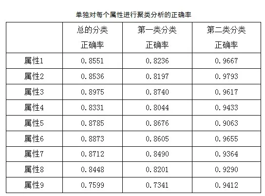 从3.2节中,得知属性9<属性5<属性7<属性4<属性2<属性3<属性8<属性1<属性6,根据ReliefF算法原理本文可以认为,对于这种属性6和属性1重要的特征属性,应该对分类起到更加到的作用。所以下面将单独对各个属性的数据进行分类测试,详细结果如下表:
