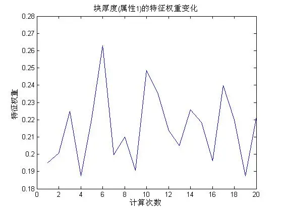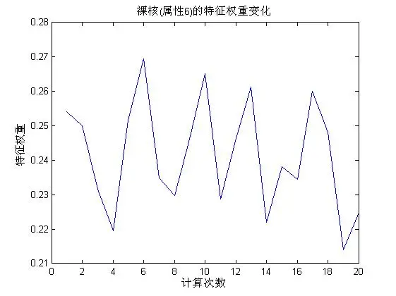 从上面的特征权重可以看出,属性6裸核大小是最主要的影响因素,说明乳腺癌患者的症状最先表现了裸核大小上,将直接导致裸核大小的变化,其次是属性1和属性8等,后几个属性权重大小接近,但是从多次计算规律来看,还是能够说明其中不同的重要程度,下面是着重对几个重要的属性进行分析。下面是20次测试中,裸核大小(属性6)的权重变化:
