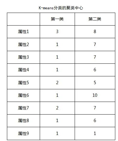 限于篇幅,只选择了上述3个特征属性进行图像绘制,从结果来看, 可以很直观的观察到K-means算法分类后的情况,第一类与第一类的分类界限比较清晰。但是不容易观察到正确和错误的情况。下表是分类结果中各个属性的聚类中心: