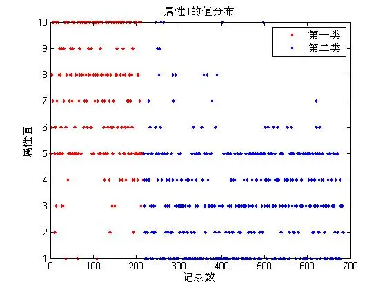 1 clc;clear; 2 load('matlab.mat')%加载测试数据 3 N0 =1 ; %从多少列开始的数据进行预测分类 4 N1 = size(data,1);%所有数据的行数 5 data=data(N0:N1,:);%只选取需要测试的数据 6 data1=data(:,[2,3,4,5,6,7,8,9]);% [2,4,7,9] 2:size(data,2)-1 7 opts = statset('Display','final');%控制选项 8 [idx,ctrs,result,D] = kmeans(data1,2,... %data1为要分类的数据,2为分类的类别数,本文只有2类 9 'Distance','city',... %选择的距离的计算方式 10 'Options',opts); % 控制选项,参考matlab帮助 11 t=[data(:,size(data,2)),idx(:,1)];%把测试数据最后一列,也就是分类属性 和 分类结果取出来:列 + 列 12 d2 = data(idx==1,11);%提取原始数据中属于第1类的数据的最后一列 13 a = sum(d2==2) ; 14 b=a/length(d2) ; 15 totalSum = 0 ;%总的正确率 16 rate1 = 0 ;%第一类的判断正确率.分类类别中数据的正确性 17 rate2 = 0 ;%第二类的判断正确率. 18 if(b>0.5) %说明第1类属于良性,则a的值就是良性中判断正确的个数 19 totalSum = totalSum + a ; 20 rate1 = a/length(d2) ; 21 %然后加上恶性中判断正确的比例 22 totalSum = totalSum + sum(data(idx==2,11)==4) ; 23 rate2 = sum(data(idx==2,11)==4)/length(data(idx==2,11)) ; 24 else %说明第1类属于恶性 25 totalSum = totalSum + sum(data(idx==1,11)==4) ; 26 totalSum = totalSum + sum(data(idx==2,11)==2) ; 27 rate1 = sum(data(idx==2,11)==2)/length(data(idx==2,11)) ; 28 rate2 = sum(data(idx==1,11)==4)/length(data(idx==1,11)) ; 29 end 30 x1 =1;%第x1个属性 31 x2 =1 ;%第x2个属性 32 plot(1:sum(idx==1),data1(idx==1,x1),'r.','MarkerSize',12); 33 hold on ; 34 plot(sum(idx==1)+1:sum(idx==1)+sum(idx==2),data1(idx==2,x1),'b.','MarkerSize',12); 35 xlabel('记录数'); 36 ylabel('属性值'); 37 title('属性9的值分布'); 38 legend('第一类','第二类'); 39 axis([0 640 0 10]) 40 rate = totalSum/size(t,1) %总的判断准确率