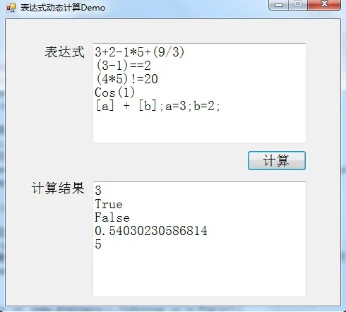 1 string[] temp = txtExpress.Text.Trim().Split(new String[] { "\r\n" }, 2 StringSplitOptions.RemoveEmptyEntries); 3 foreach (var item in temp ) 4 { 5 //对当前的表达式再次进行分割,若有参数,则添加参数 6 if (item.Contains(';')) 7 { //第一个是表达式,后面的;号都是参数名称和参数值 8 string[] param = item.Split (new char[]{';'}, 9 StringSplitOptions.RemoveEmptyEntries); 10 Expression exp = new Expression(param[0]); 11 //添加参数 12 for (int i = 1; i < param.Length ; i++) 13 { 14 //等号左边是参数名,等号右边是值,输入错误检测暂时不处理 15 string[] nameValue = param[i ].Split ('='); 16 //这里注意要对值类型进行转换,否则会直接作为字符串对待,结果会有不同 17 exp.Parameters[nameValue[0]] = Convert.ToDouble( nameValue[1]); 18 } 19 //计算结果 20 txtResult.Text += (exp.Evaluate().ToString () + "\r\n"); 21 } 22 else 23 { 24 string result = new Expression(item).Evaluate().ToString(); 25 txtResult.Text += (result + "\r\n"); 26 } 27 }