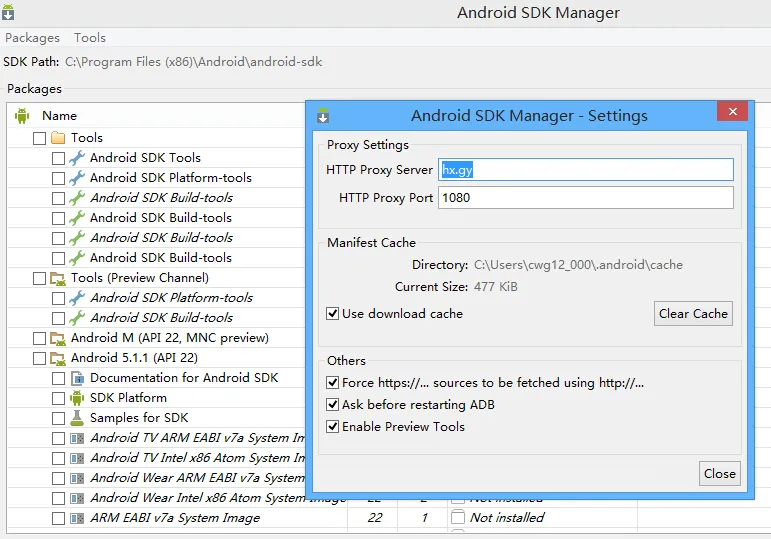 如果要更新SDK,打开Android SDK Manager,Tools -> Options...,HTTP Proxy Server里填“mirrors.dormforce.net”,Http Proxy Port里填“80”,然后勾选“Force https://...sources to be fetched using http://...”,Close后在Packages里Reload或者关闭重新打开都可。(参见:http://ubuntu.uestc.edu.cn/android/repository/)