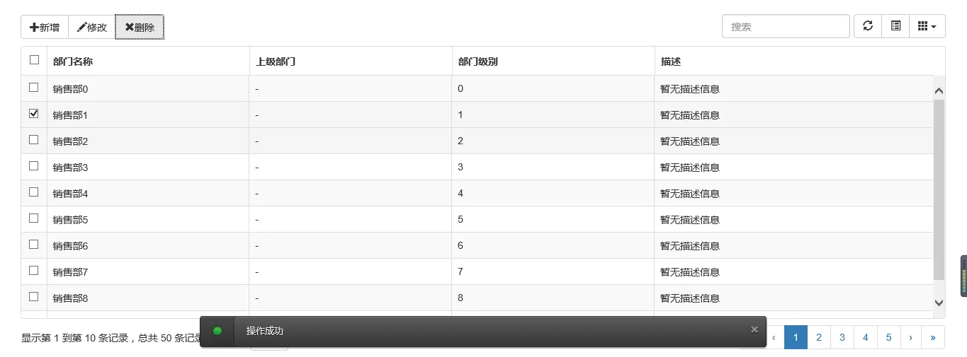 //注册删除按钮的事件 $("#btn_delete").click(function () { //取表格的选中行数据 var arrselections = $("#tb_departments").bootstrapTable('getSelections'); if (arrselections.length <= 0) { toastr.warning('请选择有效数据'); return; } Ewin.confirm({ message: "确认要删除选择的数据吗?" }).on(function (e) { if (!e) { return; } $.ajax({ type: "post", url: "/api/DepartmentApi/Delete", data: { "": JSON.stringify(arrselections) }, success: function (data, status) { if (status == "success") { toastr.success('提交数据成功'); $("#tb_departments").bootstrapTable('refresh'); } }, error: function () { toastr.error('Error'); }, complete: function () { } }); }); });