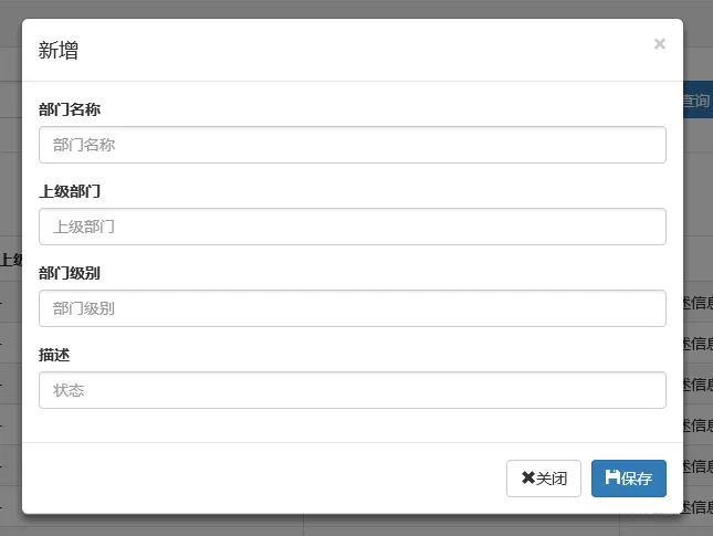 <div class="modal fade" id="myModal" tabindex="-1" role="dialog" aria-labelledby="myModalLabel"> <div class="modal-dialog" role="document"> <div class="modal-content"> <div class="modal-header"> <button type="button" class="close" data-dismiss="modal" aria-label="Close"><span aria-hidden="true">×</span></button> <h4 class="modal-title" id="myModalLabel">新增</h4> </div> <div class="modal-body"> <div class="form-group"> <label for="txt_departmentname">部门名称</label> <input type="text" name="txt_departmentname" class="form-control" id="txt_departmentname" placeholder="部门名称"> </div> <div class="form-group"> <label for="txt_parentdepartment">上级部门</label> <input type="text" name="txt_parentdepartment" class="form-control" id="txt_parentdepartment" placeholder="上级部门"> </div> <div class="form-group"> <label for="txt_departmentlevel">部门级别</label> <input type="text" name="txt_departmentlevel" class="form-control" id="txt_departmentlevel" placeholder="部门级别"> </div> <div class="form-group"> <label for="txt_statu">描述</label> <input type="text" name="txt_statu" class="form-control" id="txt_statu" placeholder="状态"> </div> </div> <div class="modal-footer"> <button type="button" class="btn btn-default" data-dismiss="modal"><span class="glyphicon glyphicon-remove" aria-hidden="true"></span>关闭</button> <button type="button" id="btn_submit" class="btn btn-primary" data-dismiss="modal"><span class="glyphicon glyphicon-floppy-disk" aria-hidden="true"></span>保存</button> </div> </div> </div> </div>