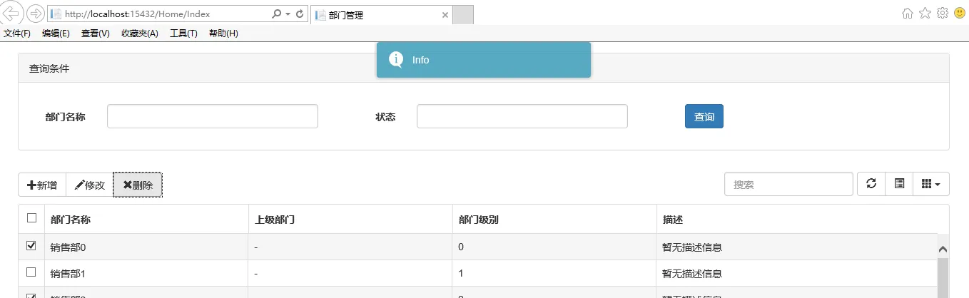 $("#btn_delete").click(function () { $.globalMessenger().post({ message: "操作成功",//提示信息 type: 'info',//消息类型。error、info、success hideAfter: 2,//多长时间消失 showCloseButton:true,//是否显示关闭按钮 hideOnNavigate: true //是否隐藏导航 }); });