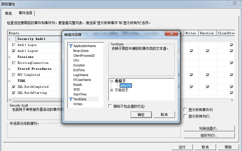 首先那个select%是个筛选监测的TextData。那个%是个通配符,他的意思就是筛选select开口的语句。当然这你自己可以随便定义,如update%,delete%....。