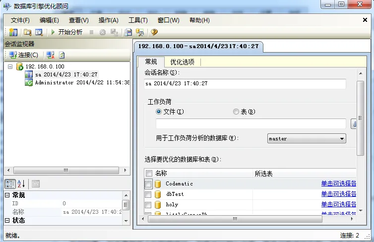 打开系统主菜单--sqlserver几---性能工具--->>数据库引擎优化顾问,界面如下