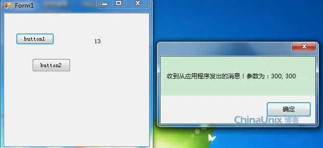 发送端Form2:button1启动接收端,button2关闭接收端,button3传递系统消息和自定义的消息。
