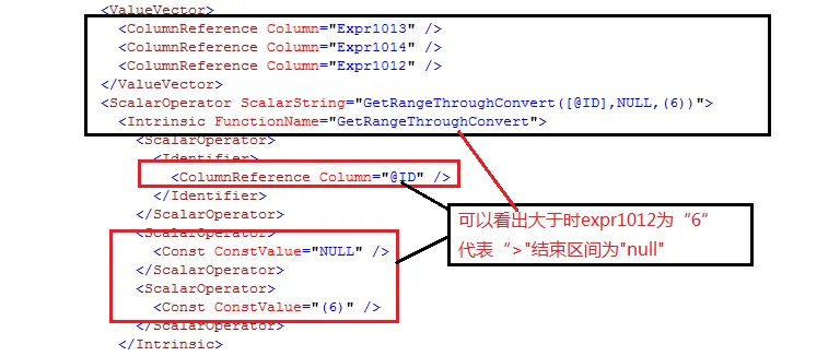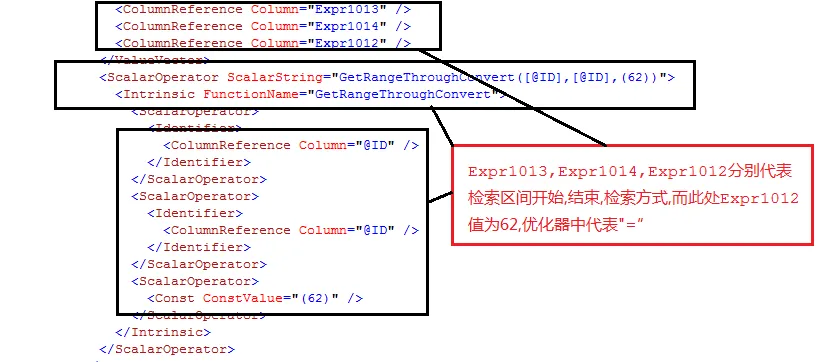 可以看到图1-2中的输出列表Expr-1013,Expr-1014,Expr-1012而在实际执行操作中这三个输出对象分别代表常量的开始值,结束值,和所需执行的操作,打开其XML执行计划详细信息可以看到Expr-1013值为@ID, Expr-1014值为@ID, Expr-1012值为62,而62就是代表”=”