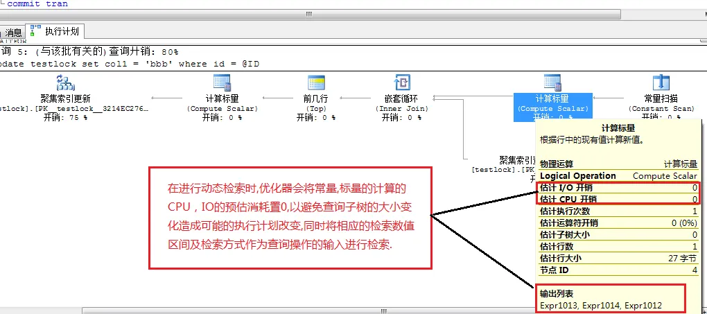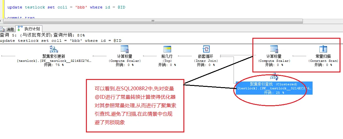 可以看到因为SQL Server将变量@ID进行了额外的转换运算,使得其作为数值进行处理,从而进行索引查找以提升效率,这就是动态检索的初衷,在此却也同时规避了死锁的发生.