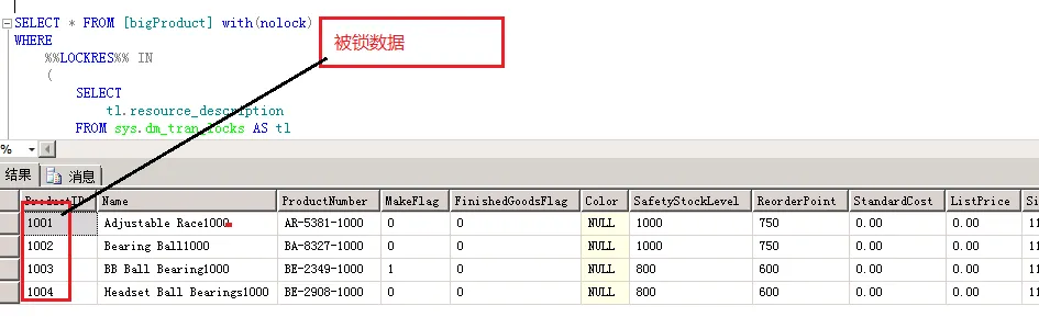 begin tran ttt update dbo.[bigProduct] set size=111 where ProductID<1100 -- rollback when finish test --rollback tran ttt --open another session SELECT * FROM [bigProduct] with(nolock) WHERE %%LOCKRES%% IN ( SELECT tl.resource_description FROM sys.dm_tran_locks AS tl INNER JOIN sys.partitions AS t2 ON t2.hobt_id = tl.resource_associated_entity_id WHERE t2.object_id = OBJECT_ID('bigProduct') AND tl.resource_type = 'KEY' )