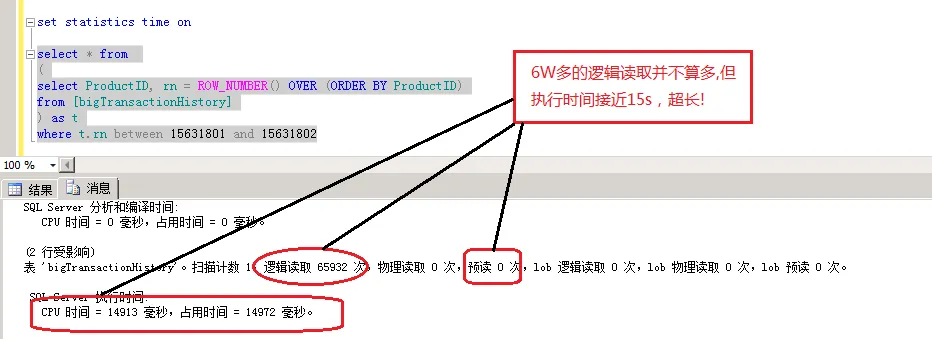 set statistics time on select * from ( select ProductID, rn = ROW_NUMBER() OVER (ORDER BY ProductID) from [bigTransactionHistory] ) as t where t.rn between 15631801 and 15631802