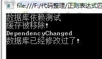 static void Main(string[] args) { Cache cache = HttpRuntime.Cache; System.Data.SqlClient.SqlDependency.Start(@"Server=KISSDODOG-PC;Database=Nx;uid=sa;pwd=123;"); // 创建缓存依赖 SqlConnection conn = new SqlConnection(@"Server=KISSDODOG-PC;Database=Nx;uid=sa;pwd=123;"); SqlCommand command = new SqlCommand("select Id,name from dbo.Record", conn); SqlCacheDependency dependency = new SqlCacheDependency(command); //注意,创建的command与SqlCacheDependency绑定要在command执行之前 SqlDataAdapter adapter = new SqlDataAdapter(command); DataSet ds = new DataSet(); adapter.Fill(ds); //这里要特别注意,Fill才是真正执行 cache.Insert("DD", "数据库依赖测试", dependency); Console.WriteLine(cache["DD"]); Thread.Sleep(20000); //暂停20秒给你更改一下数据库 if (cache["DD"] == null) { Console.WriteLine("数据库已经修改过了!"); } Console.ReadKey(); System.Data.SqlClient.SqlDependency.Stop(@"Server=KISSDODOG-PC;Database=Nx;uid=sa;pwd=123;"); }