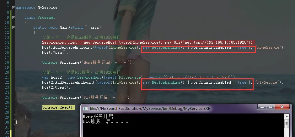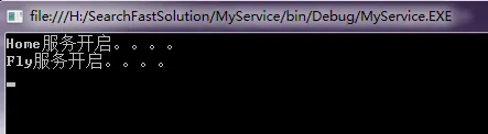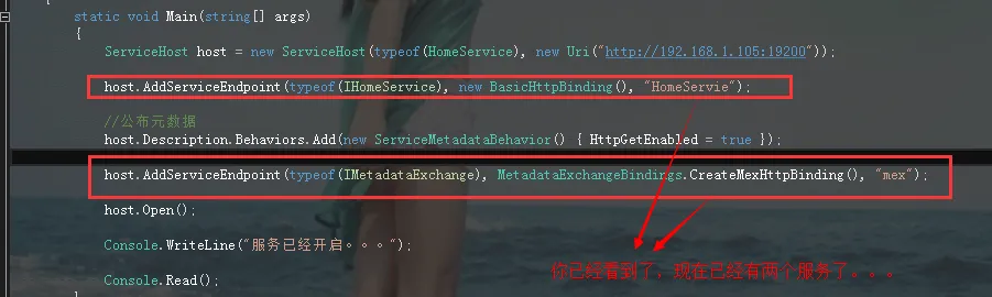 1 class Program1 2 { 3 static void Main(string[] args) 4 { 5 //第一个: 这是Home服务 6 ServiceHost host = new ServiceHost(typeof(HomeService), new Uri("http://192.168.1.105:1920")); 7 host.AddServiceEndpoint(typeof(IHomeService), new BasicHttpBinding(), "HomeServie"); 8 host.Description.Behaviors.Add(new ServiceMetadataBehavior() { HttpGetEnabled = true }); 9 host.AddServiceEndpoint(typeof(IMetadataExchange), MetadataExchangeBindings.CreateMexHttpBinding(), "mex"); 10 host.Open(); 11 12 Console.WriteLine("Home服务开启。。。。"); 13 14 //第一个: 这是Fly服务 15 var host2 = new ServiceHost(typeof(FlyService), new Uri("http://192.168.1.105:1930")); 16 host2.AddServiceEndpoint(typeof(IFlyService), new BasicHttpBinding(), "FlyServie"); 17 host2.Description.Behaviors.Add(new ServiceMetadataBehavior() { HttpGetEnabled = true }); 18 host2.AddServiceEndpoint(typeof(IMetadataExchange), MetadataExchangeBindings.CreateMexHttpBinding(), "mex"); 19 host2.Open(); 20 21 Console.WriteLine("Fly服务开启。。。。"); 22 23 Console.Read(); 24 } 25 }