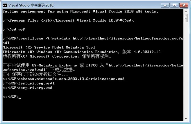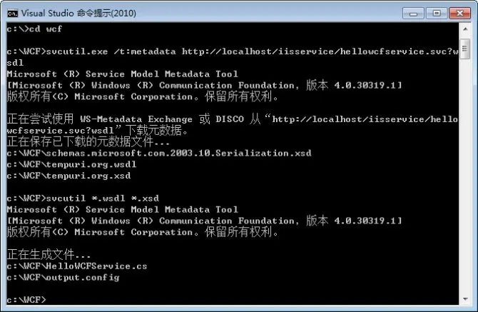 svcutil.exe /t:metadata http://localhost/iisservice/hellowcfservice.svc?wsdl我们加入了一个参数/t:metadata 表示只输出元数据,不生成代码。命令的执行过程如下: