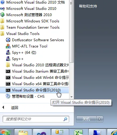 开始-->所有程序-->Visual Studio 2010-->Visual Studio Tools-->Visual Studio命令行提示