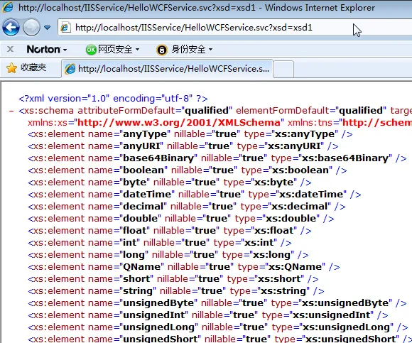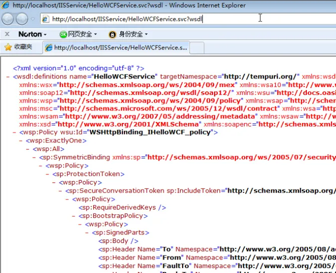 这就是在前文中我们看到的方法,我们可以使用HTTP Get的方法来获得WSDL文件即在服务地址.svc后面跟上?wsdl的方法直接请求到WSDL文件。我们可以直接在浏览器中输入服务端地址.svc?wsdl,浏览器就直接获得了WSDL文件并为我们显示出来了。