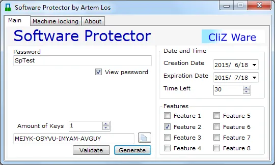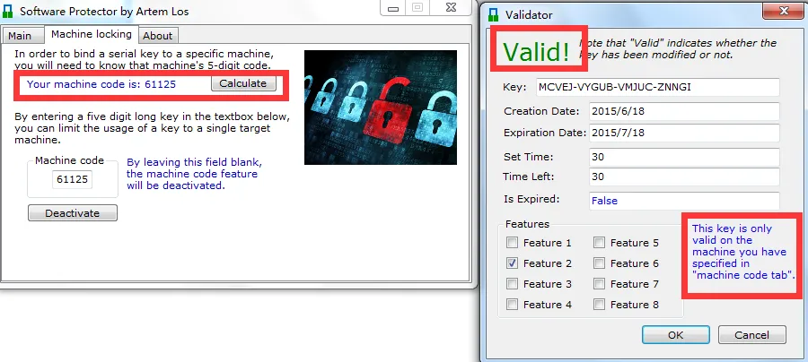 如上图可以验证密钥是否修改,以及是否过期,以及对应的机器码是否和本机一样。在实际使用中,如果要锁定机器,必须先获得机器码,然后生成对应的才行。