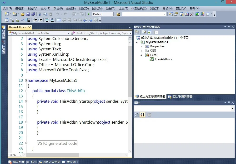 从图中可以看出,刚创建的VSTO外接程序都只有一个ThisAddIn.cs文件,该文件即是一个宿主项(更多关于宿主项和宿主控件的内容可以查看该系列的第一篇博文),我们可以通过这个文件来对Excel对象进行访问。同时该类中有ThisAddIn_Startup和ThisAddIn_Shutdown两个方法,从两个方法中命名中可以知道,如果你的代码想在加载外接程序时运行的话,就放把代码放在ThisAddIn_Startup方法内容,如果你想在外接程序卸载的时候运行你的代码,就把这些代码放在ThisAddIn_Shutdown方法内。