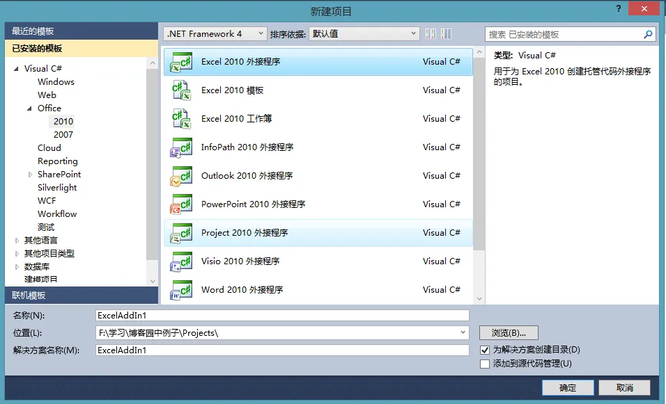 第一步, 选择新建项目->Visual C#->Office->2010,然后选择Excel 2010外接程序(如何是英文版即Excel 2010 Add-in),如下图: