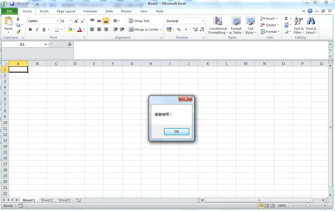 点击Excel窗口上的"X"按钮时,就会弹出一个 “谢谢使用!”的窗口,效果如下: