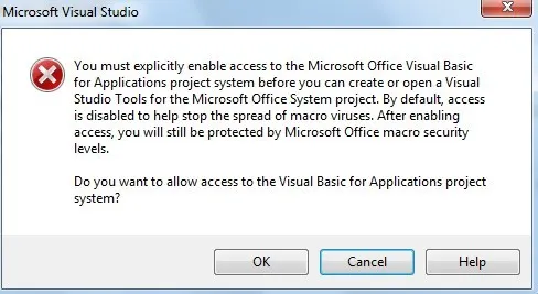 3. 在第一创建Excel工作簿项目是会弹出下面的一个窗口(窗口意思为:是否允许创建的项目访问VBA项目系统),此时我们只需要点击“Ok”就完成了Excel工作簿项目的创建。