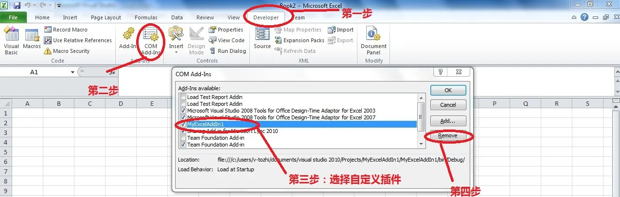 点击 Ok 按钮之后才会正常退出Excel。这样就完成了一个简单的Excel外接程序了,上面提到过外接程序是应用程序级别的,所以当你每次打开Excel的时候都会有这样的一个欢迎界面和关闭Excel时都有一个"谢谢使用"窗口,有些朋友想问了,如果我想卸载这个插件怎么办呢?方法很简单,只需要右键你的解决方案——>清理,这样可以了,另外你也可以从开发工具选项卡——>COM 插件,在弹出的窗口中选择你自定义的插件 再按下移除按钮。具体步骤见下图: