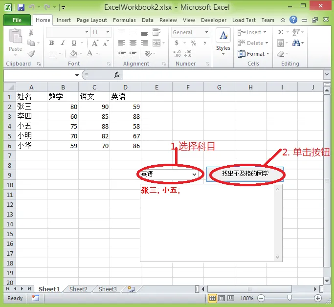 现在我们来模拟一个需求,比如现在有一个成绩单工作表,我们希望获得各科目不及格同学的名字。此时我们只需要在上面创建的工作簿项目中添加一个ComboBox,一个Button,一个textbox。在button的Click事件中添加下面的代码: