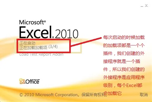从图中可以看到,除了外接程序外,还有Excel模板和Excel文档这两种项目类型,他们的区别是 外接程序是应用程序级别的,即如果你创建了Excel 2010外接程序,该程序对所有Excel应用都是有效的,因为每次Excel的启动过程都会加载该插件(即该程序),大家肯定留意到当我们启动Excel或Word的时候都会加载一些加载项,其实这些加载项就是属于外接程序,即插件,启动过程见下面图: