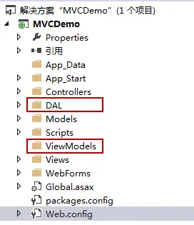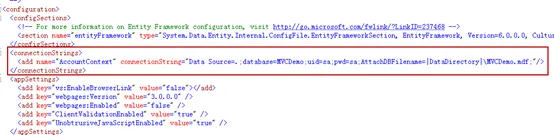 NOTE AttachDBFilename=|DataDirectory|\MVCDemo.mdf设定了数据库文件的存放位置:在项目根目录的App_Data文件夹下。