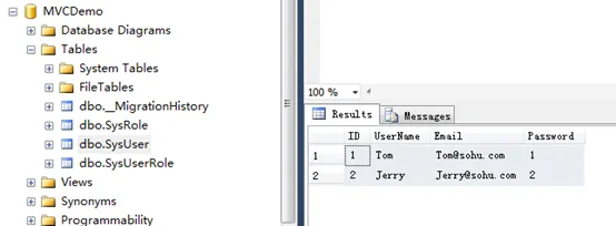 打开数据库,发现MVCDemo这个数据库已经新建,示例数据已经插入。