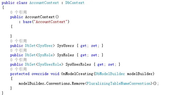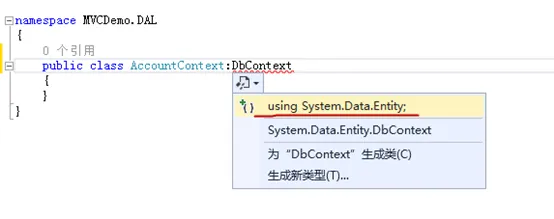 创建类 AccountContext.cs , 让他继承自System.Data.Entity.DbContext, 我们用这个类完成EF的功能。