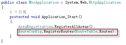 打开Global.asax, 注意到在程序启动的时候注册了路由规则,如下方框处。