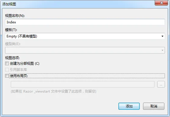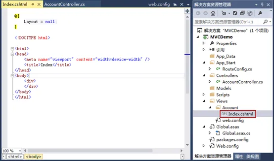 这样就添加了一个和特定的Controller和Action(这里指AccountController和Index)相对应的View(ViewsàAccountàIndex.cshtml)