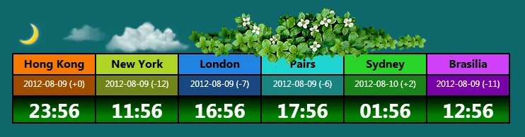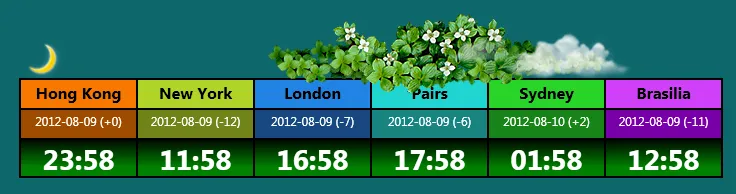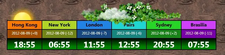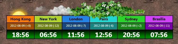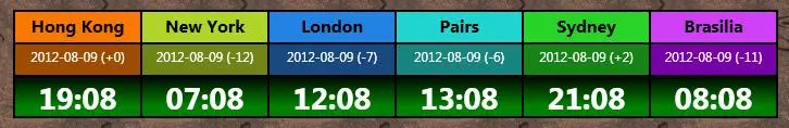 <Border Grid.Column="0"> <TextBlock FontFamily="@微软雅黑" Padding="0,5,0,0" FontSize="12pt" Foreground="Black" FontWeight="bold" Background="#FFF87800" TextAlignment="Center"><Run Text="Hong Kong"/></TextBlock></Border> <Border Grid.Column="1"> <TextBlock Background="#FFB0D428" Padding="0,5,0,0" FontFamily="@微软雅黑" FontSize="16" FontWeight="Bold" Foreground="Black" Text="New York" TextAlignment="Center"/></Border> <Border Grid.Column="2"> <TextBlock Background="#FF2283E4" Padding="0,5,0,0" FontFamily="@微软雅黑" FontSize="16" FontWeight="Bold" Foreground="Black" Text="London" TextAlignment="Center"/></Border> <Border Grid.Column="3"> <TextBlock Background="#FF20D4D0" Padding="0,5,0,0" FontFamily="@微软雅黑" FontSize="16" FontWeight="Bold" Foreground="Black" Text="Pairs" TextAlignment="Center"/></Border> <Border Grid.Column="4"> <TextBlock Background="#FF28D428" Padding="0,5,0,0" FontFamily="@微软雅黑" FontSize="16" FontWeight="Bold" Foreground="Black" Text="Sydney" TextAlignment="Center"/></Border> <Border Grid.Column="5"> <TextBlock Background="#FFD040F8" Padding="0,5,0,0" FontFamily="@微软雅黑" FontSize="16" FontWeight="Bold" Foreground="Black" Text="Brasilia" TextAlignment="Center"/></Border> <Border Grid.Column="0" Grid.Row="1"> <TextBlock x:Name="HK" Padding="0,5,0,0" Background="#FFA04C00" FontFamily="@微软雅黑" FontSize="12" Foreground="White" TextAlignment="Center" TextWrapping="NoWrap" TextTrimming="None"><Run Text="Hong Kong"/></TextBlock></Border> <Border Grid.Column="1" Grid.Row="1"> <TextBlock x:Name="NY" Padding="0,5,0,0" Background="#FF708418" FontFamily="@微软雅黑" FontSize="12" Foreground="White" TextAlignment="Center" TextWrapping="NoWrap" TextTrimming="None"><Run Text="Hong Kong"/></TextBlock></Border> <Border Grid.Column="2" Grid.Row="1"> <TextBlock x:Name="UK" Padding="0,5,0,0" Background="#FF184880" FontFamily="@微软雅黑" FontSize="12" Foreground="White" TextAlignment="Center" TextWrapping="NoWrap" TextTrimming="None"><Run Text="Hong Kong"/></TextBlock></Border> <Border Grid.Column="3" Grid.Row="1"> <TextBlock x:Name="PS" Padding="0,5,0,0" Background="#FF188480" FontFamily="@微软雅黑" FontSize="12" Foreground="White" TextAlignment="Center" TextWrapping="NoWrap" TextTrimming="None"><Run Text="Hong Kong"/></TextBlock></Border> <Border Grid.Column="4" Grid.Row="1"> <TextBlock x:Name="SD" Padding="0,5,0,0" Background="#FF188418" FontFamily="@微软雅黑" FontSize="12" Foreground="White" TextAlignment="Center" TextWrapping="NoWrap" TextTrimming="None"><Run Text="Hong Kong"/></TextBlock></Border> <Border Grid.Column="5" Grid.Row="1"> <TextBlock x:Name="BR" Padding="0,5,0,0" Background="#FF7800A8" FontFamily="@微软雅黑" FontSize="12" Foreground="White" TextAlignment="Center" TextWrapping="NoWrap" TextTrimming="None"><Run Text="Hong Kong"/></TextBlock></Border> <Border Grid.Column="0" Grid.Row="2"> <TextBlock x:Name="HKT" Padding="0,5,0,0" FontFamily="@Gill Sans MT" FontSize="21pt" Foreground="White" TextAlignment="Center" FontWeight="Bold"><Run Text="Load"/></TextBlock></Border> <Border Grid.Column="1" Grid.Row="2"> <TextBlock x:Name="NYT" Padding="0,5,0,0" FontFamily="@Gill Sans MT" FontSize="21pt" Foreground="White" TextAlignment="Center" FontWeight="Bold"><Run Text="Load"/></TextBlock></Border> <Border Grid.Column="2" Grid.Row="2"> <TextBlock x:Name="UKT" Padding="0,5,0,0" FontFamily="@Gill Sans MT" FontSize="21pt" Foreground="White" TextAlignment="Center" FontWeight="Bold"><Run Text="Load"/></TextBlock></Border> <Border Grid.Column="3" Grid.Row="2"> <TextBlock x:Name="PST" Padding="0,5,0,0" FontFamily="@Gill Sans MT" FontSize="21pt" Foreground="White" TextAlignment="Center" FontWeight="Bold"><Run Text="Load"/></TextBlock></Border> <Border Grid.Column="4" Grid.Row="2"> <TextBlock x:Name="SDT" Padding="0,5,0,0" FontFamily="@Gill Sans MT" FontSize="21pt" Foreground="White" TextAlignment="Center" FontWeight="Bold"><Run Text="Load"/></TextBlock></Border> <Border Grid.Column="5" Grid.Row="2"> <TextBlock x:Name="BRT" Padding="0,5,0,0" FontFamily="@Gill Sans MT" FontSize="21pt" Foreground="White" TextAlignment="Center" TextDecorations="None" FontWeight="Bold" Background="Transparent"><Run Text="Load"/></TextBlock></Border>