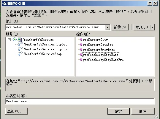 首先,我们在程序中添加WebService服务引用,添加效果如下图所示,我们需要用到其中的GetWeatherByCityName方法来获取天气预报信息。
