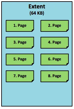 在上一世纪存储是非常,非常贵的。那是的目标就是尽可能有效的使用存储。因为新表和索引的第1个8页总是分配在混合区。这也意味着你的表或索引刚开始创建时总在8k的块(混合区)里。这样的话小表保持很小的存储占用。你正在尽可能有效的使用存储。当你的数据库对象需要分配第9个页时,SQL Server会分配整个统一区给那个数据库对象。它的大小从8kb 变成了72kb,到第17个页它的增长从72kb 变成了136kb,然后按此规律继续增长。现在你会对那个事实表示摇头,但在上个世纪,这曾是非常重要的设计选择。下面的图片会展示了一个区看起来是什么样(在一个非常简化的方式下)。