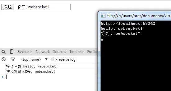1 class Program 2 { 3 static void Main(string[] args) 4 { 5 WebSocketServer server = new WebSocketServer(); 6 server.NewSessionConnected += server_NewSessionConnected; 7 8 server.NewMessageReceived += server_NewMessageReceived; 9 server.SessionClosed += server_SessionClosed; 10 try 11 { 12 server.Setup("127.0.0.1", 40001);//设置端口 13 server.Start();//开启监听 14 } 15 catch (Exception ex) 16 { 17 Console.WriteLine(ex.Message); 18 } 19 Console.ReadKey(); 20 } 21 22 static void server_SessionClosed(WebSocketSession session, SuperSocket.SocketBase.CloseReason value) 23 { 24 Console.WriteLine(session.Origin); 25 } 26 27 static void server_NewMessageReceived(WebSocketSession session, string value) 28 { 29 Console.WriteLine(value); 30 session.Send(value); 31 } 32 33 static void server_NewSessionConnected(WebSocketSession session) 34 { 35 Console.WriteLine(session.Origin); 36 } 37 }