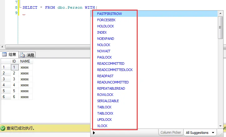 1 SELECT * FROM dbo.Person(HOLDLOCK)