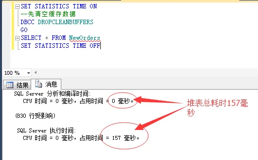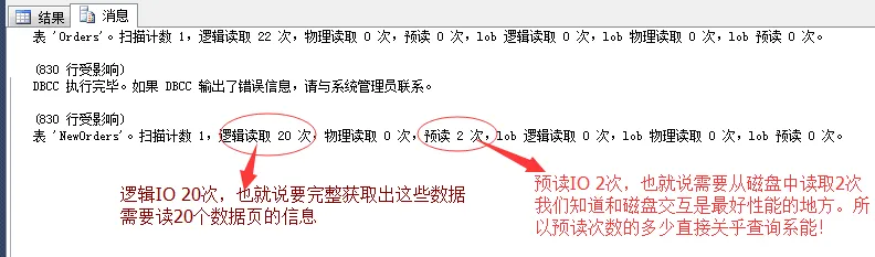 SET STATISTICS IO ON --新建个测试表 SELECT * INTO NewOrders FROM Orders --先清空缓存数据 DBCC DROPCLEANBUFFERS GO SELECT * FROM NewOrders SET STATISTICS IO OFF
