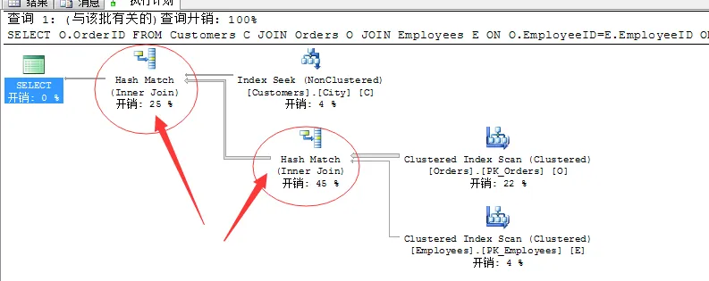 当然,此方式也是SQL Server认为的一种最优方式,但是如果数据量多的话,此种方式将会造成内存严重的消耗。