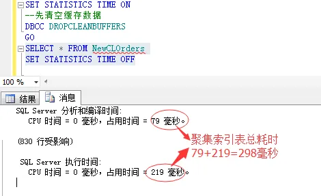 SET STATISTICS IO ON --新建个测试表 SELECT * INTO NewCLOrders FROM Orders --添加聚集索引 CREATE CLUSTERED INDEX CL_OrderID ON NewCLOrders (OrderID desc) GO --先清空缓存数据 DBCC DROPCLEANBUFFERS GO SELECT * FROM NewCLOrders SET STATISTICS IO OFF