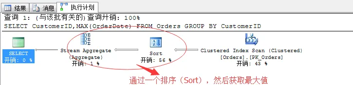 通过查询计划我们可以推测出肯定在CustomerID列存在索引,这样SQL Serer能直接利用这个进行排序,但是即便如此消耗还是飙升到56%....然后通过再加上一个流聚合计算出最大订单日期。