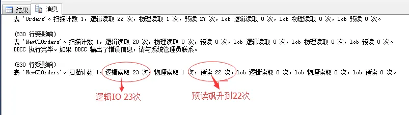采用聚集索引的表,逻辑IO为23次,预读飙升至22次。