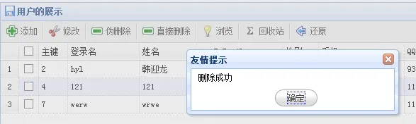 前言:前面两篇博客我实现了用户的注册功能,分为两篇来介绍,主要就是介绍一些简单的验证以及用户名不能为空,密码和确认密码等必须一样,那么后面我们将不会在详细的讲述这点内容,只要我们讲述具体的思路我想大家都可以明白,那么今天我们就来说用户的多条数据删除以及用户的修改信息等,当然我也会把主要的代码贴出来供大家看看,因为后面的很多东西都是很简单的,所以我也就是大致的说一下,希望大家能够自己敲一遍代码,那么什么都就知道了,下面我们就开始讲述我们今天的内容吧。